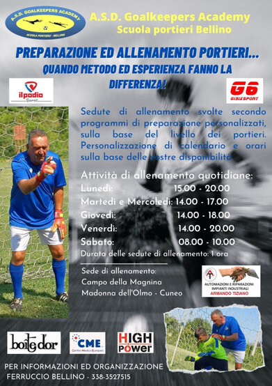 . ![]() | Ripartono gli allenamenti con l’A.s.d. Goalkeepers Academy. Per informazioni e iscrizioni è possibile contattare Ferruccio Bellino al numero di cellulare 338-3527515. | |
